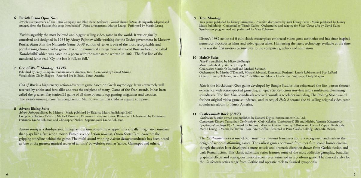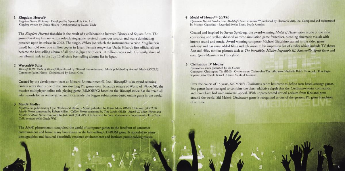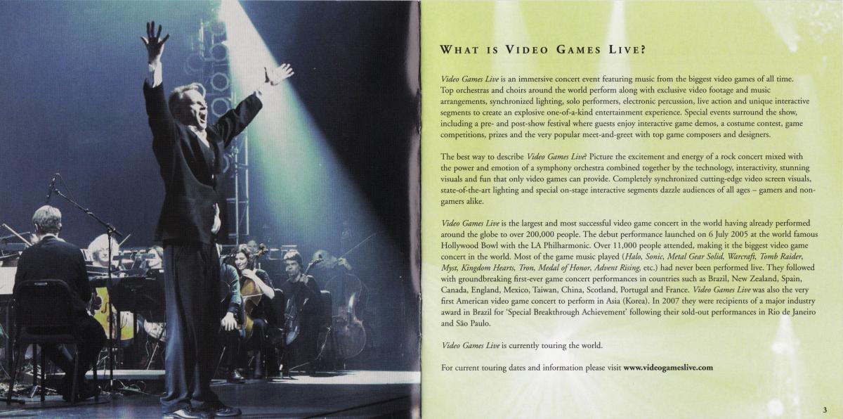Задержавшийся VGL-диск, похоже, наконец-то явится публике. 11 переаранжированных тем из таких хитов, как Halo, Myst, Warcraft, God of War... – список ещё долго можно продолжать. Весь материал был записан при участии Словацкого национального оркестра, хора The Crouch End Festival Chorus, а также пианиста-виртузоа Мартина Леунга (The...Задержавшийся VGL-диск, похоже, наконец-то явится публике. 11 переаранжированных тем из таких хитов, как Halo, Myst, Warcraft, God of War... – список ещё долго можно продолжать. Весь материал был записан при участии Словацкого национального оркестра, хора The Crouch End Festival Chorus, а также пианиста-виртузоа Мартина Леунга (The Video Game Pianist). Дирижёрами и продюсерами шоу, как всегда, выступили Томми Талларико и Джек Волл. Интересно, что по первоначальным планам выпустить диск планировалось ещё в 2007 году.