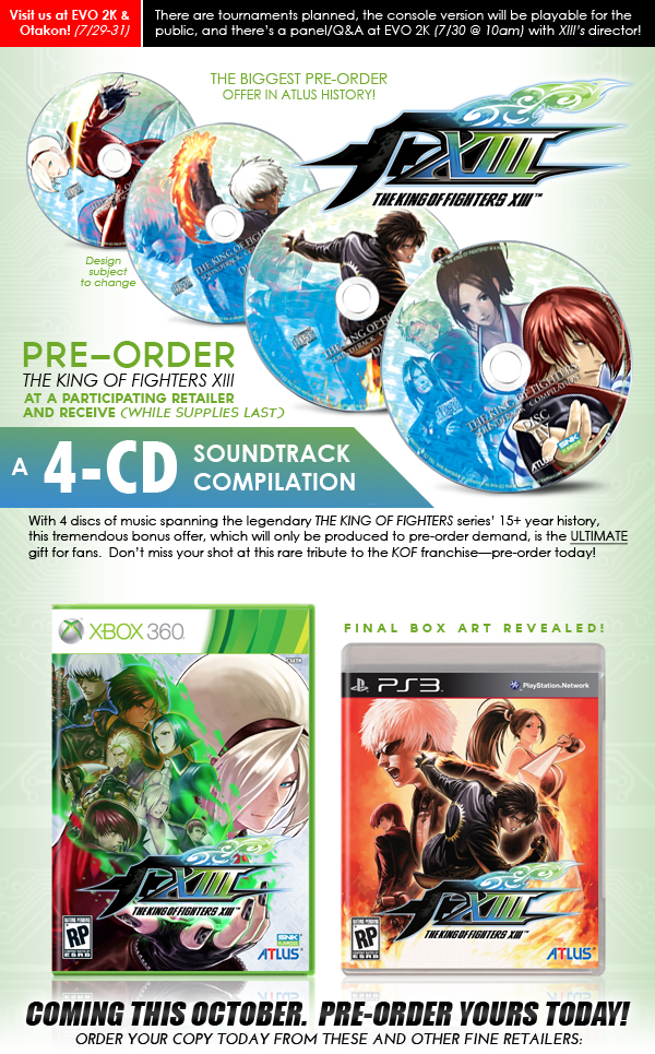 4 CD Set offered while supplies last by some retailers for pre-ordering "The King of Fighters XIII" for PS3 and Xbox360.