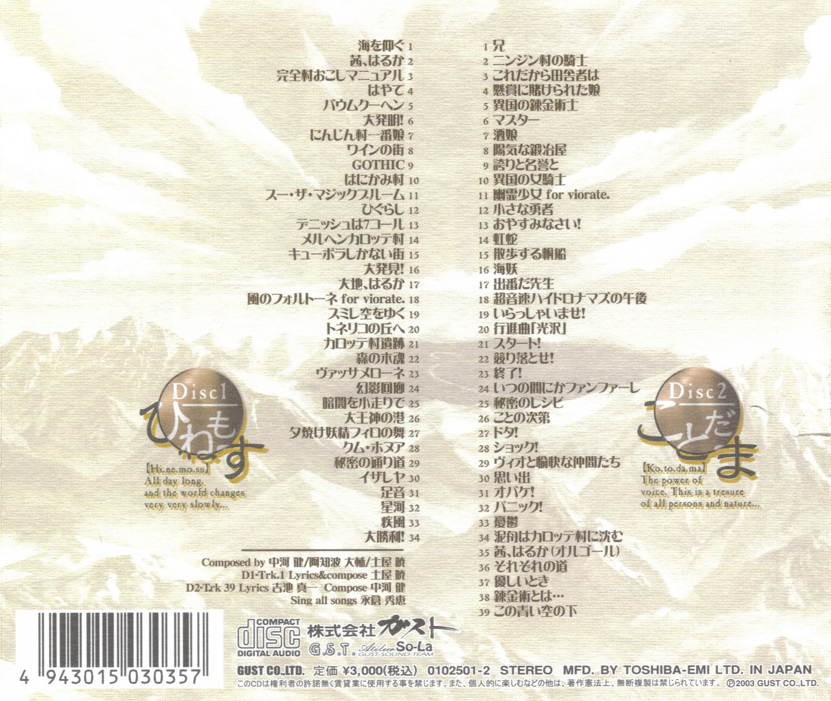 Composed by: Akira Tsuchiya (Disc 1: 1, 7, 9, 11, 13, 18, 20, 26, 27, 30. Disc 2: 38)