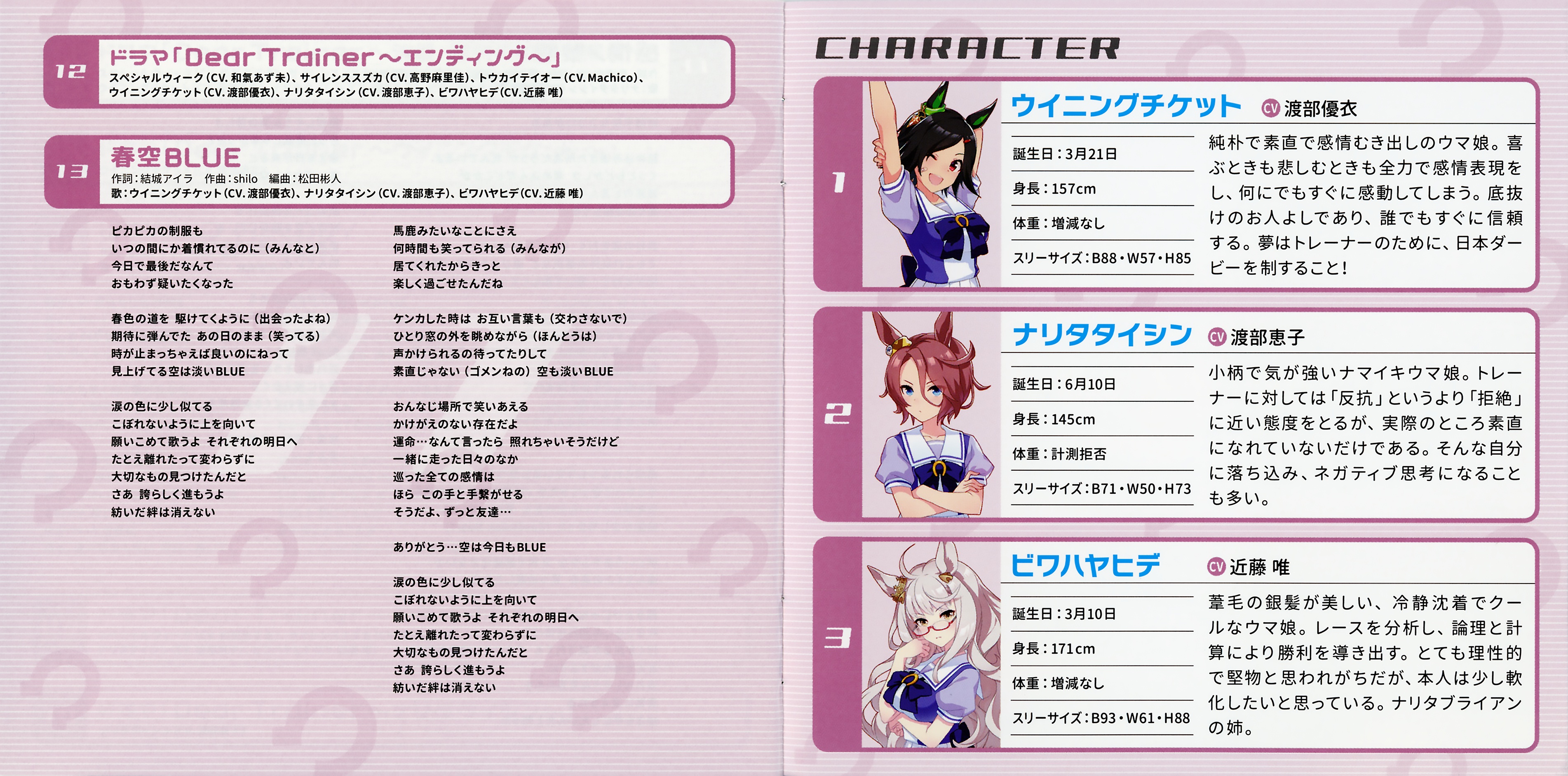 Исполнено: Winning Ticket (CV: Yui Watanabe), Narita Taishin (CV: Keiko Watanabe), Biwa Hayahide (CV: Yui Kondou)