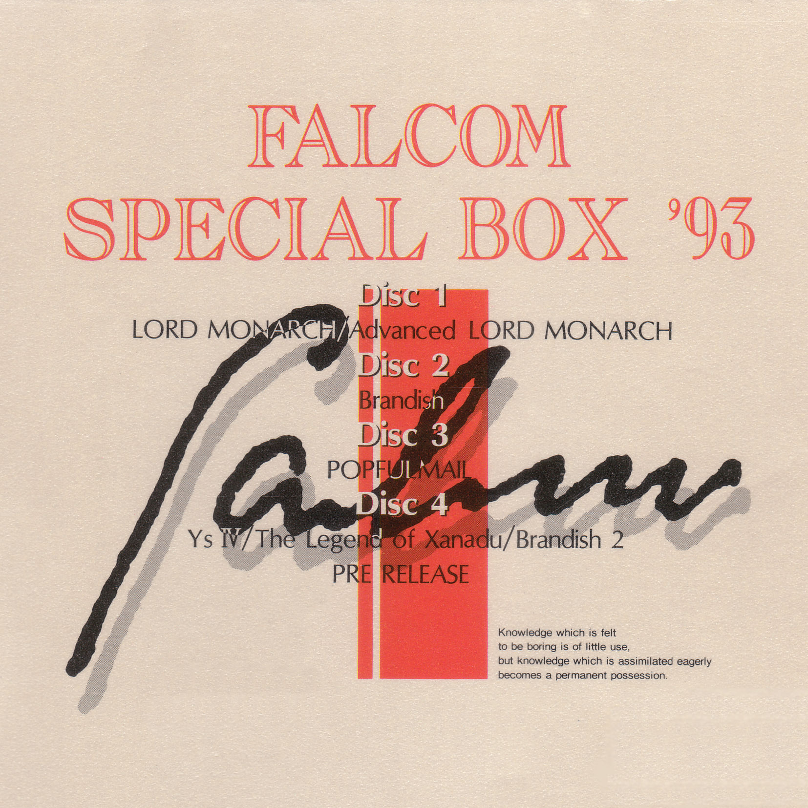 Ниже можно послушать бесплатное онлайн превью треков из саундтрека Falcom Special Box '93 . Над альбомом работал японский композитор Falcom Sound Team JDK (Dragon Slayer ~ The Legend of Heroes, Perfect Collection , Legend of Heroes -Sora no Kiseki the 3rd- , Sorcerian Mega Drive Version ), а его релиз состоялся 24 декабря 1992 года. На саундтрек попало 50 композиций общей длительностью более часа. Подборка является компиляцией оригинальной музыки. Выпуском пластинки занимался лейбл Falcom . Превью альбома предоставлено iTunes . Вы можете прослушать все композиции прямо на сайте. Если вам понравился саундтрек Falcom Special Box '93 , то мы настоятельно советуем купить его, поддержав таким образом композиторов, артистов и исполнителей. К тому же, это недорого. В российском сегменте iTunes он стоит всего 199 руб. Цены и магазины, где можно купить альбом, указаны в правой колонке. CD 1 1 Opening Falcom Sound Team jdk 02:32
