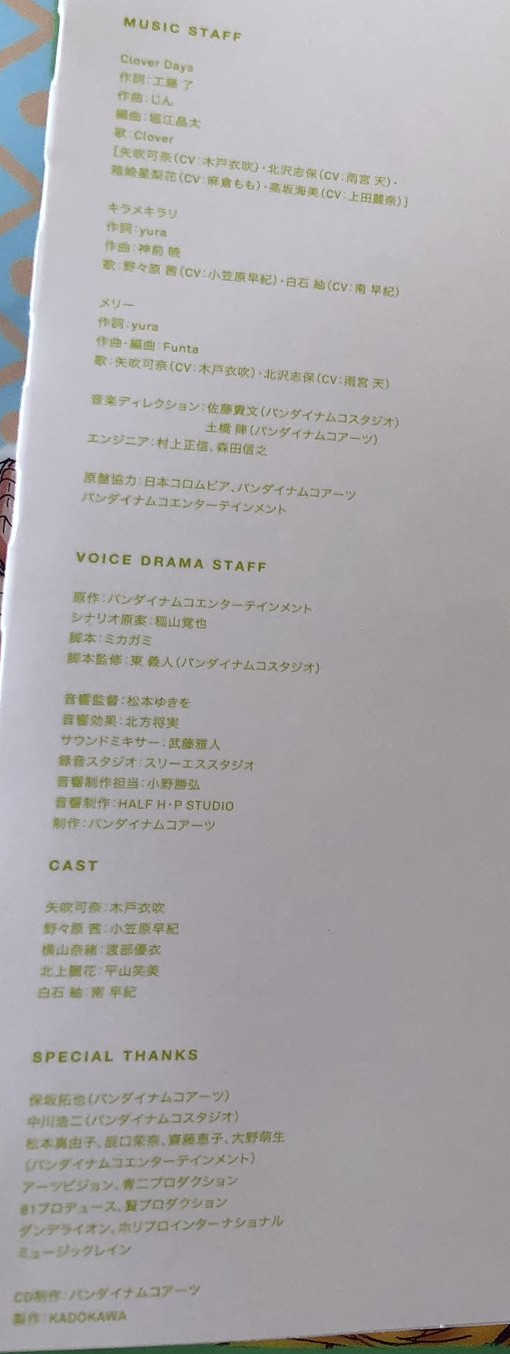 Вокал: Clover [Kana Yabuki (CV: Ibuki Kido), Shiho Kitazawa (CV: Sora Amamiya), Serika Hakozaki (CV: Momo Asakura), Umi Kousaka (CV: Reina Ueda)]