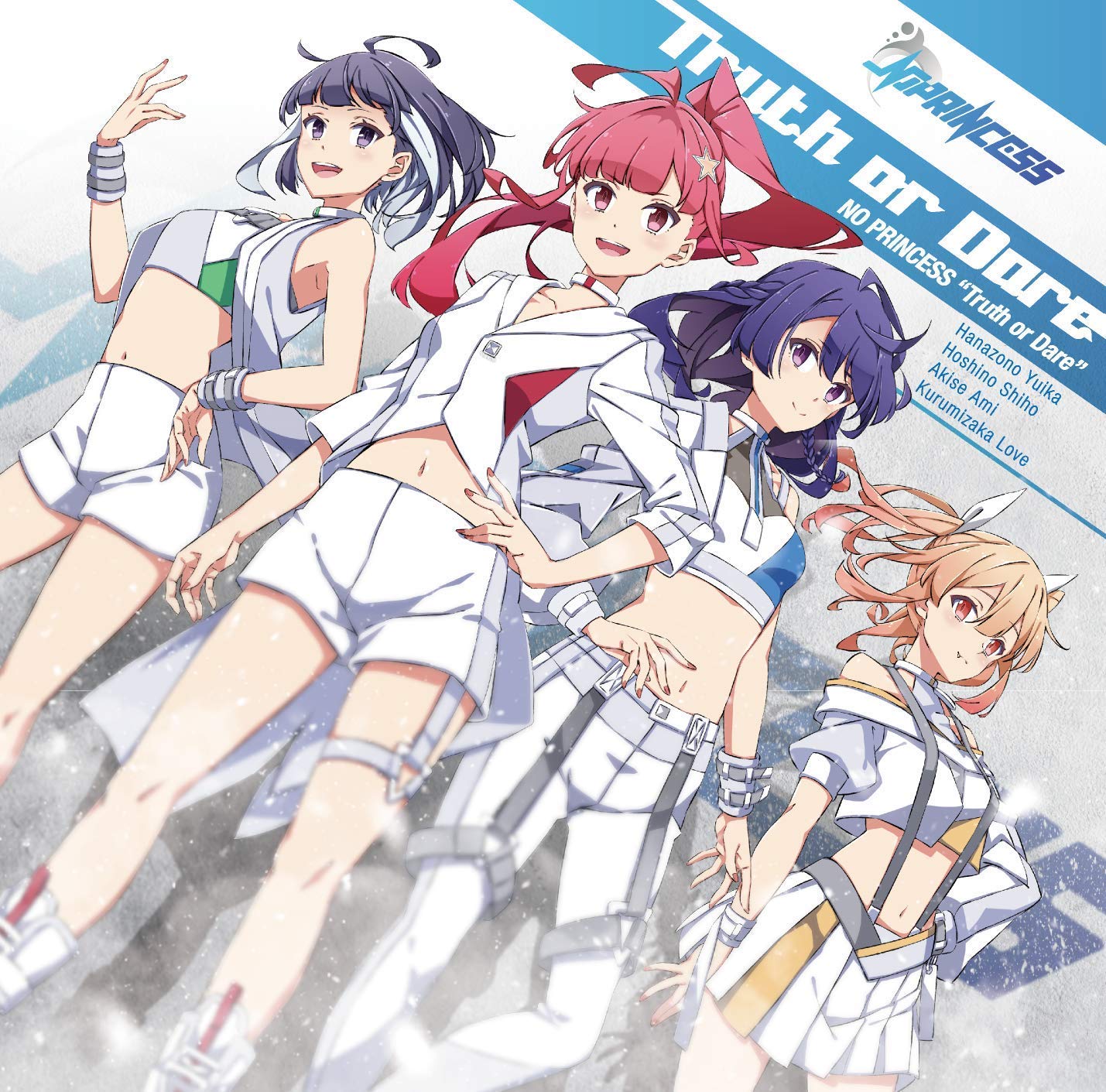 NO PRINCESS это Yuika Hanazono (CV: Sachika Misawa), Shiho Hoshino (CV: Reo Kurachi), Ami Akise (CV: Marina Horiuchi), Love Kurumizaka (CV: Hisayo Abe [阿部寿世])