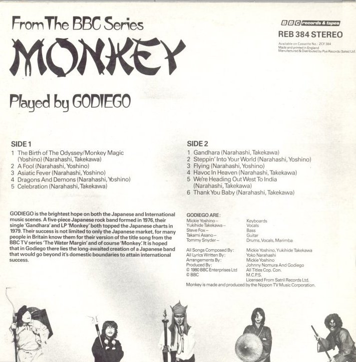 GODIEGO is the brightest hope on both the Japanese and International music scenes. A five-piece Japanese rock band formed in 1976, their single 'Gandhara' and LP 'Monkey' both topped the Japanese charts in 1979. Their success is not limited to only the Japanese market, for many people in Britain know them for their version of the title song from the BBC TV series 'The Water Margin' and of course 'Monkey'. It is hoped that in Godiego there lies the long-awaited creation of a Japanese band that would go beyond it's domestic boundaries to attain international success.