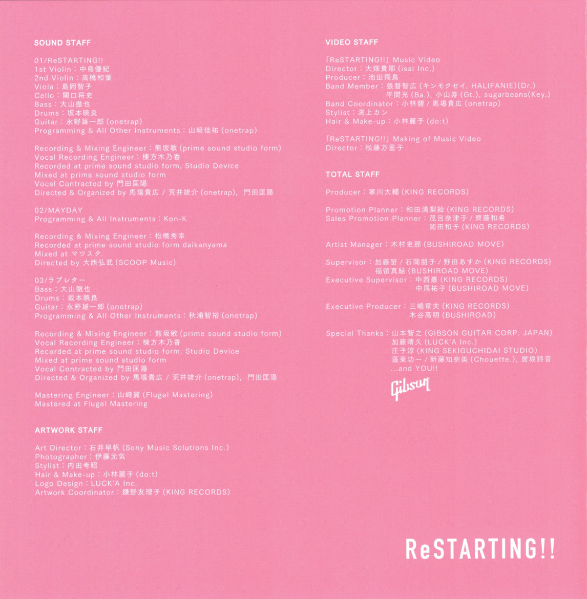 Special Thanks: Tomoyuki Yamamoto (GIBSON GUITAR CORP. JAPAN), Haruhisa Kato (LUCK'A Inc.), Jun Shouji (KING SKIGUCHIDAI STUDIO), 蓬莱功一, 新藤知奈美 (Chouette.), 居坂詩音... and YOU!!
