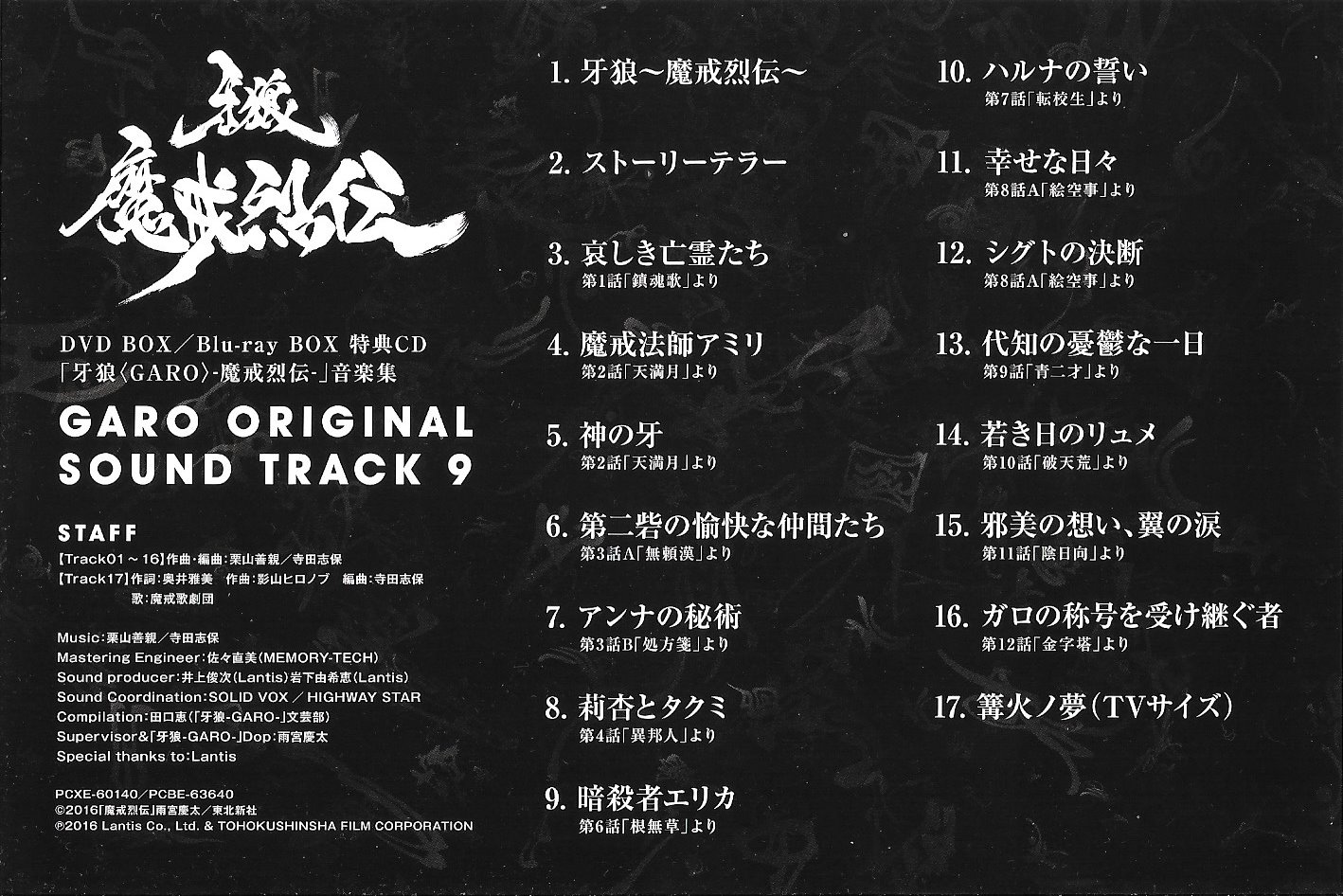 The original soundtrack for the 2016 tokusatsu anthology series "GARO: MAKAI RETSUDEN," commemorating the 10th anniversary of the GARO franchise.