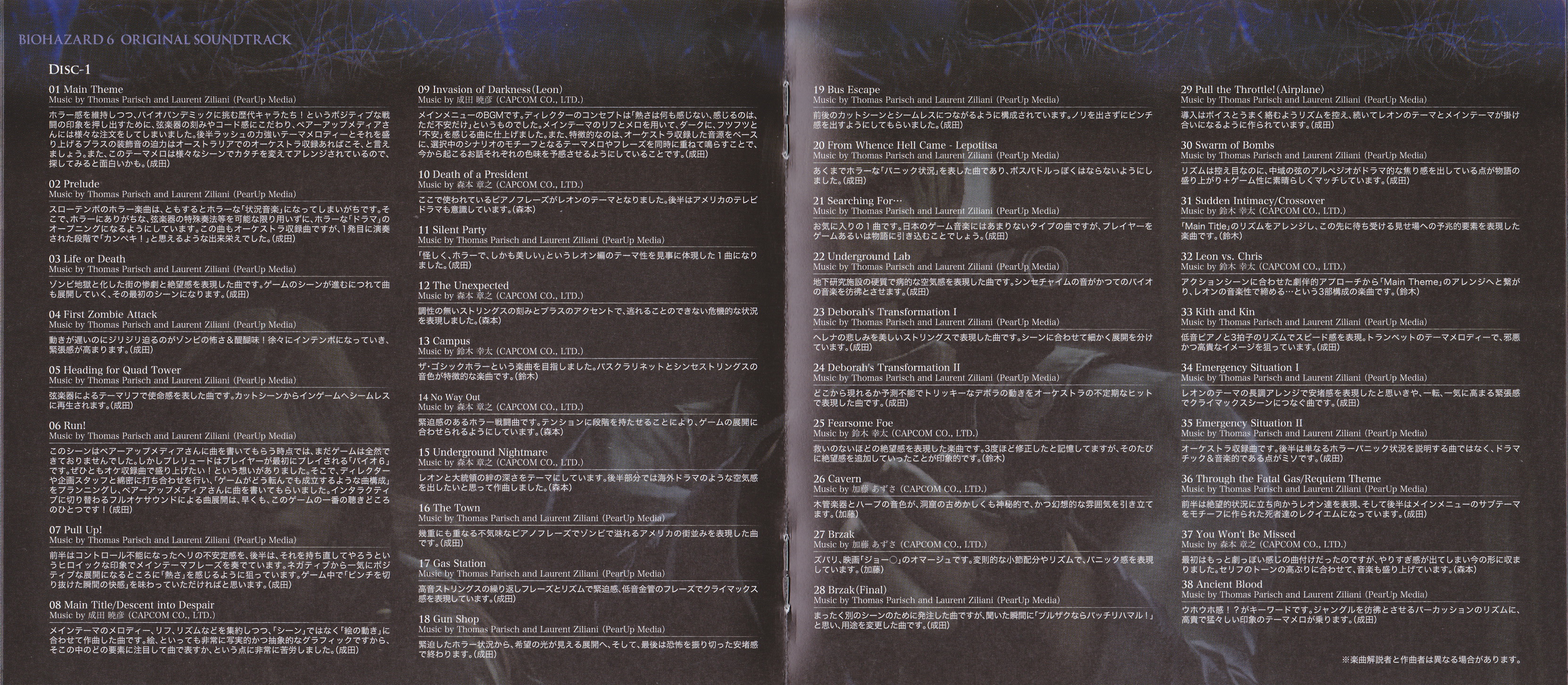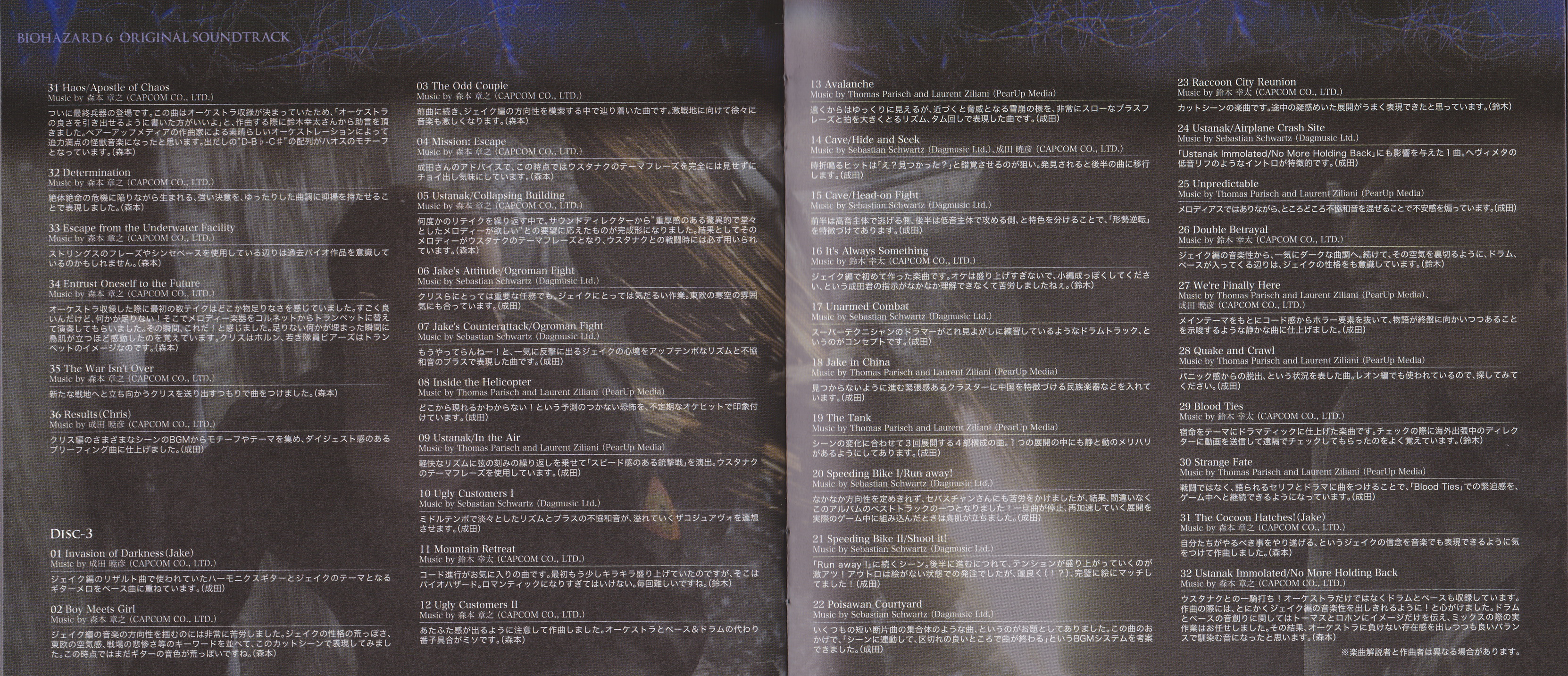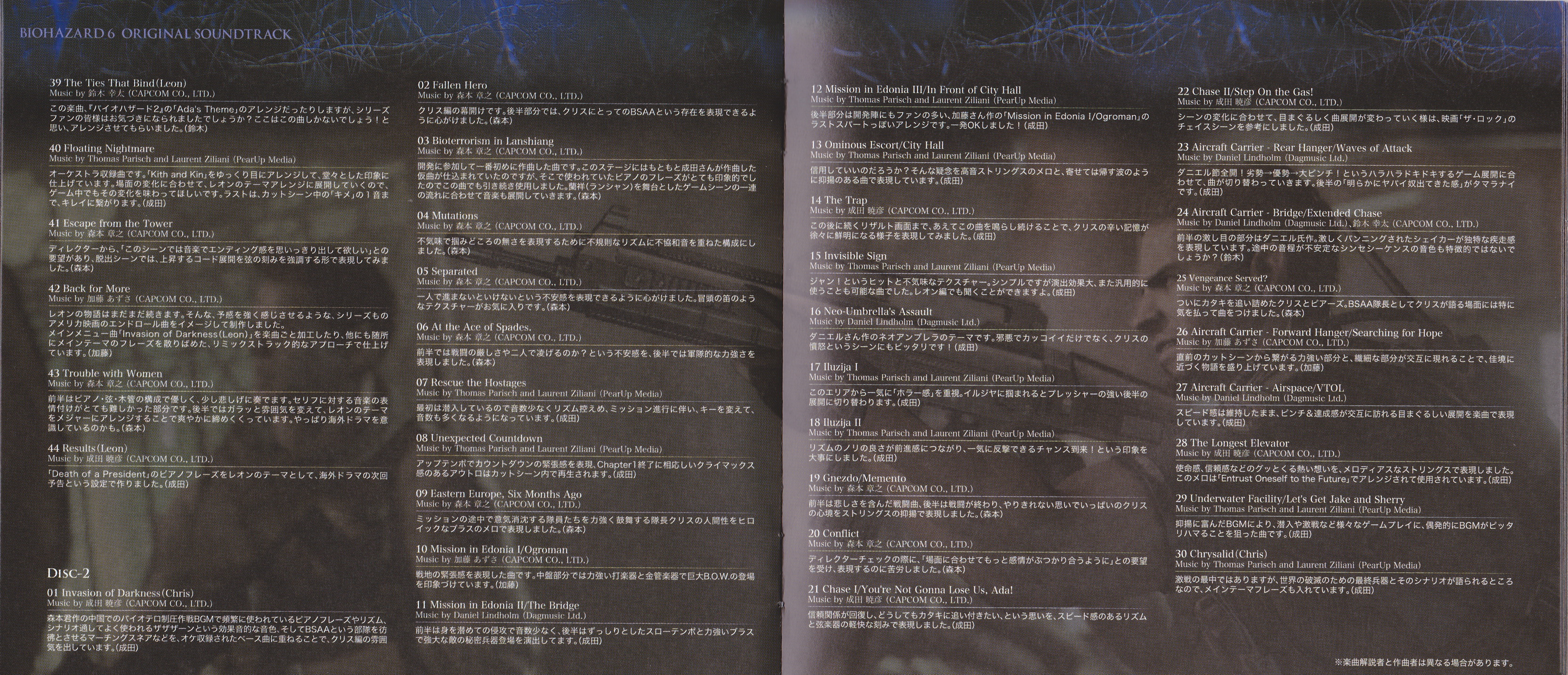 Японская версия саундтрека на целых два диска и почти на сто треков больше западной. В истории серии так уже было неоднократно. Обычная практика, можно сказать. Тут и политика более бюджетных изданий, да и меньший интерес к музыке серии за океаном сказывается. Но объективно некоторая излишняя растянутость OST всех последних номерных частей Biohazard при прослушивании «резиновых» японских релизов особой пользы или удовольствия, в сравнении с западными, не приносит. В последние включают самые основные и интересные темы, в то время как определенный процент проходных композиций вырезается. Так что полное и объективное мнение о саундтреках франшизы, можно вполне составить и после прослушивания ее западных изданий.