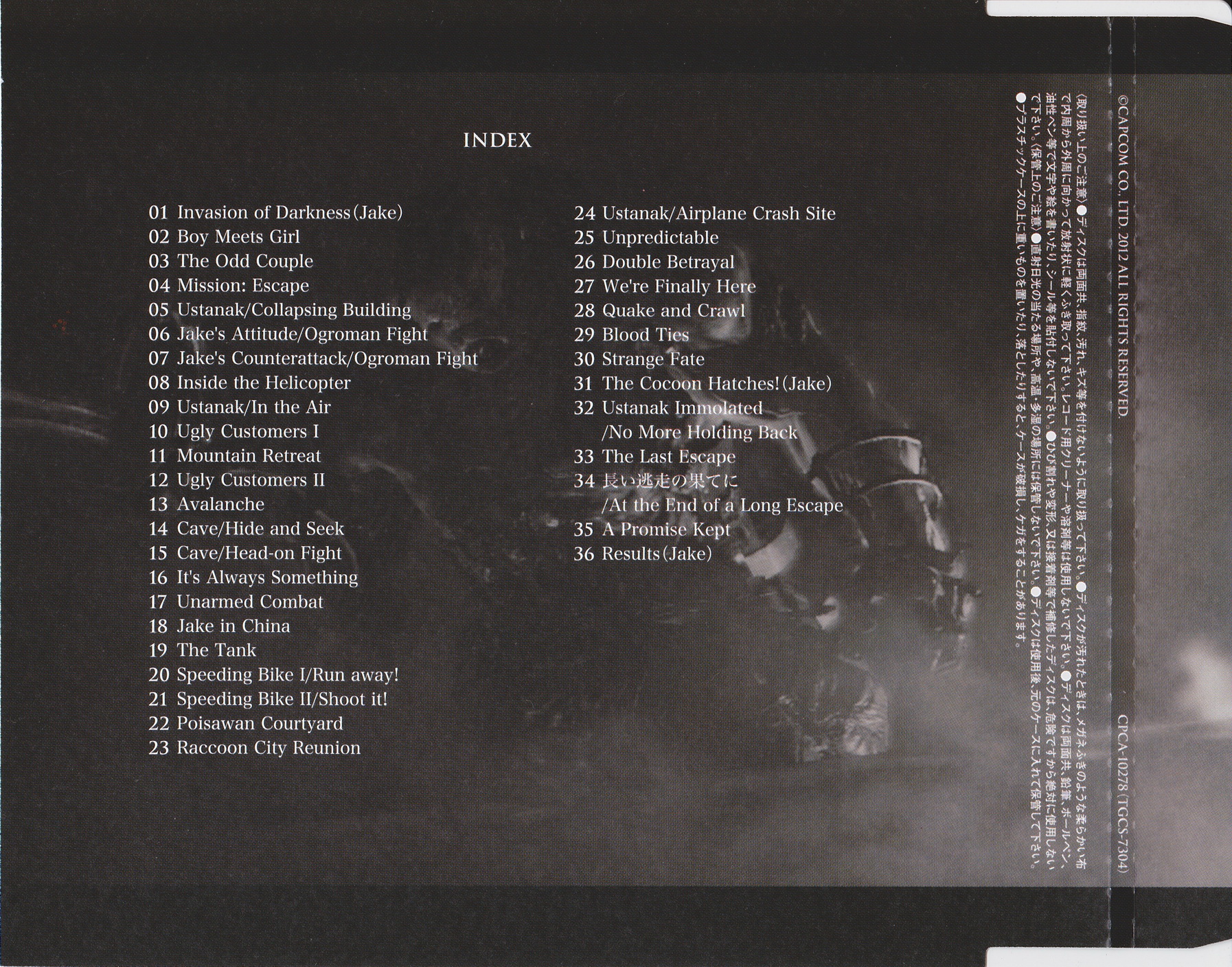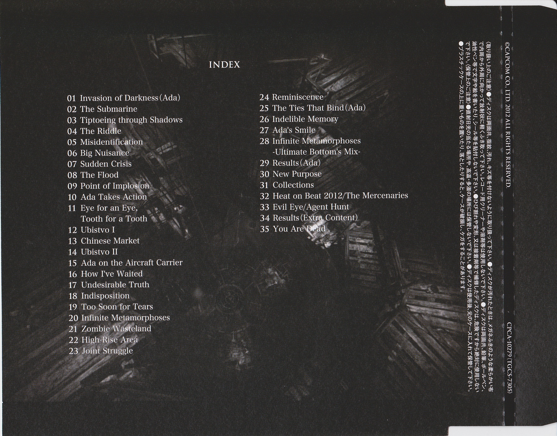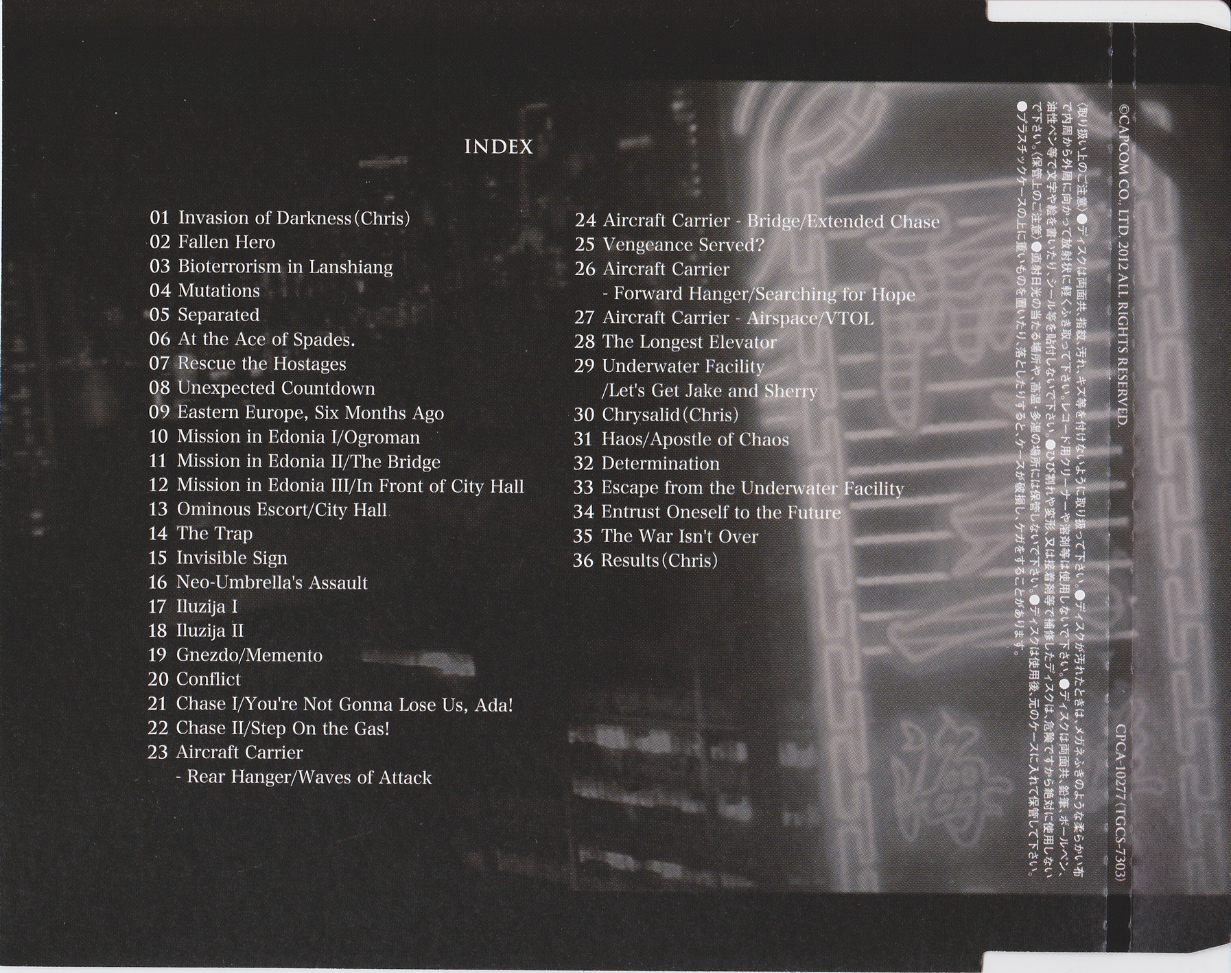 Японская версия саундтрека на целых два диска и почти на сто треков больше западной. В истории серии так уже было неоднократно. Обычная практика, можно сказать. Тут и политика более бюджетных изданий, да и меньший интерес к музыке серии за океаном сказывается. Но объективно некоторая излишняя растянутость OST всех последних номерных частей Biohazard при прослушивании «резиновых» японских релизов особой пользы или удовольствия, в сравнении с западными, не приносит. В последние включают самые основные и интересные темы, в то время как определенный процент проходных композиций вырезается. Так что полное и объективное мнение о саундтреках франшизы, можно вполне составить и после прослушивания ее западных изданий.