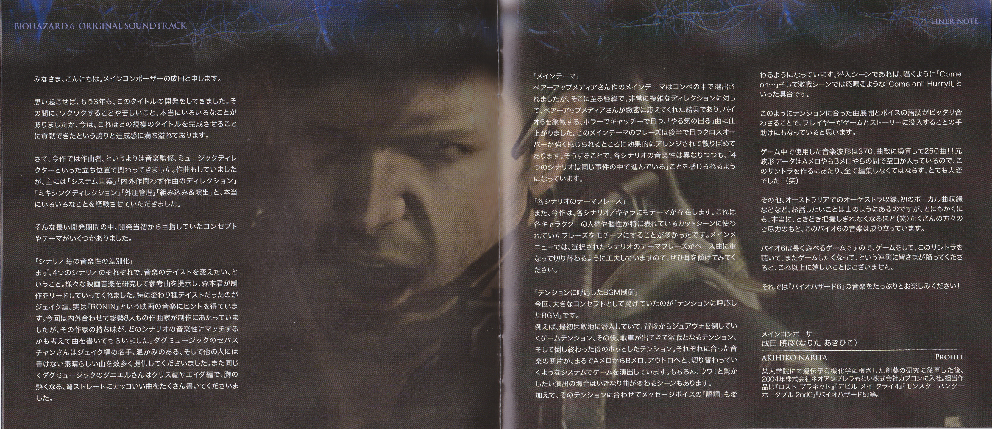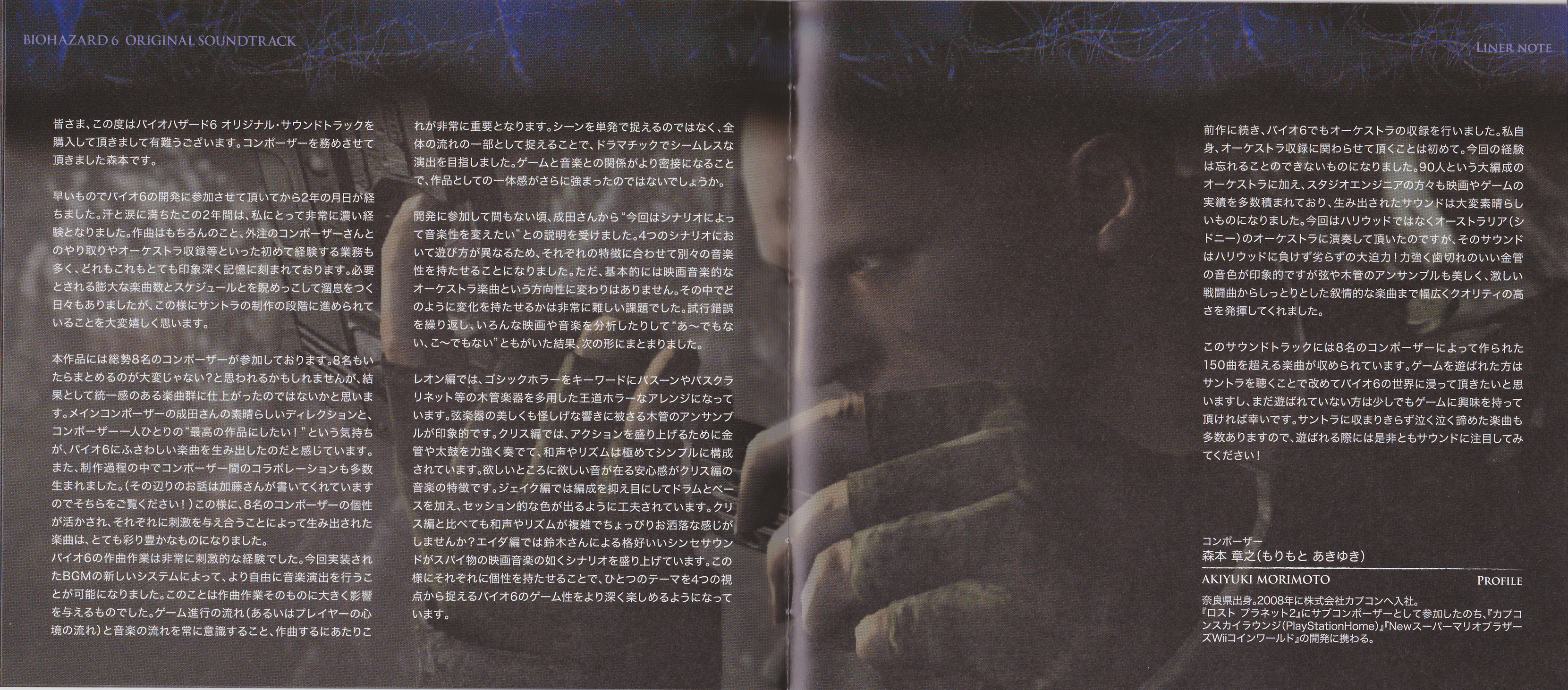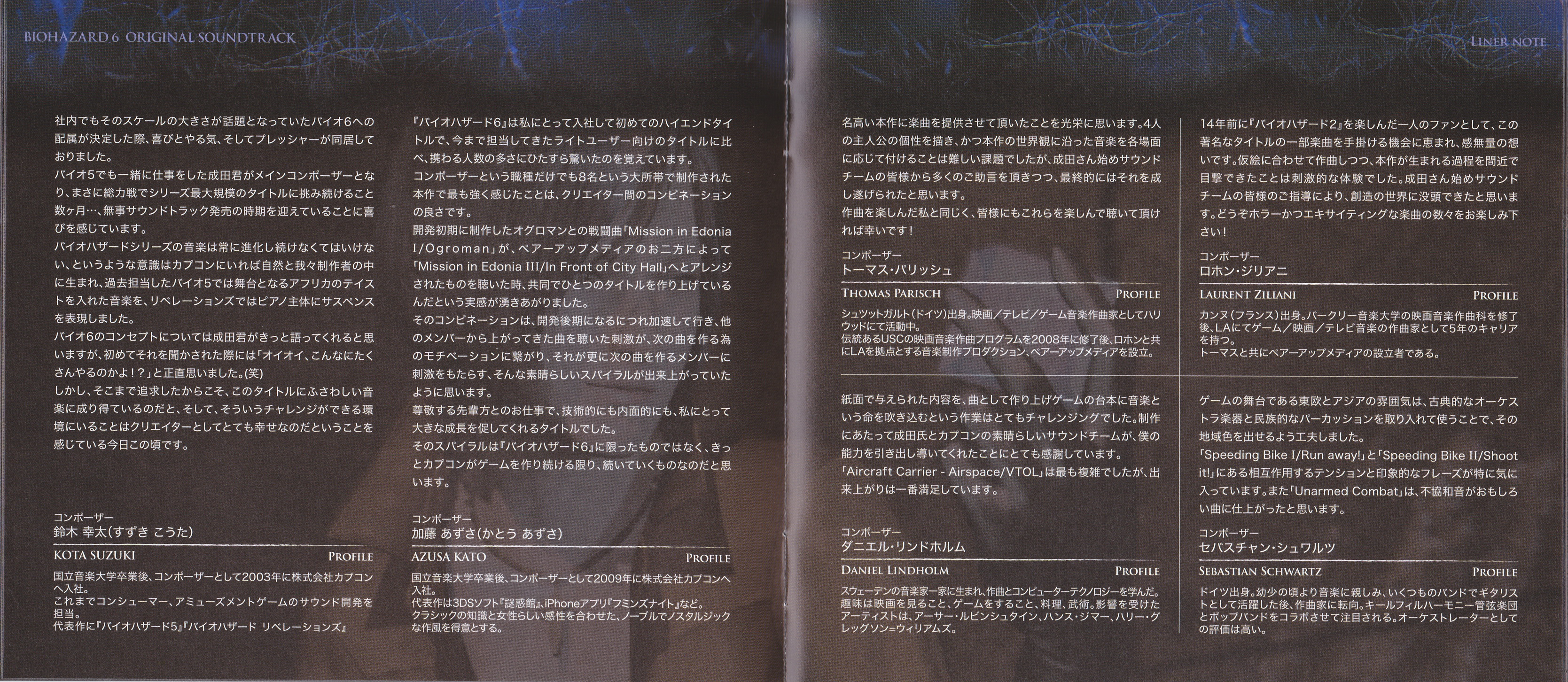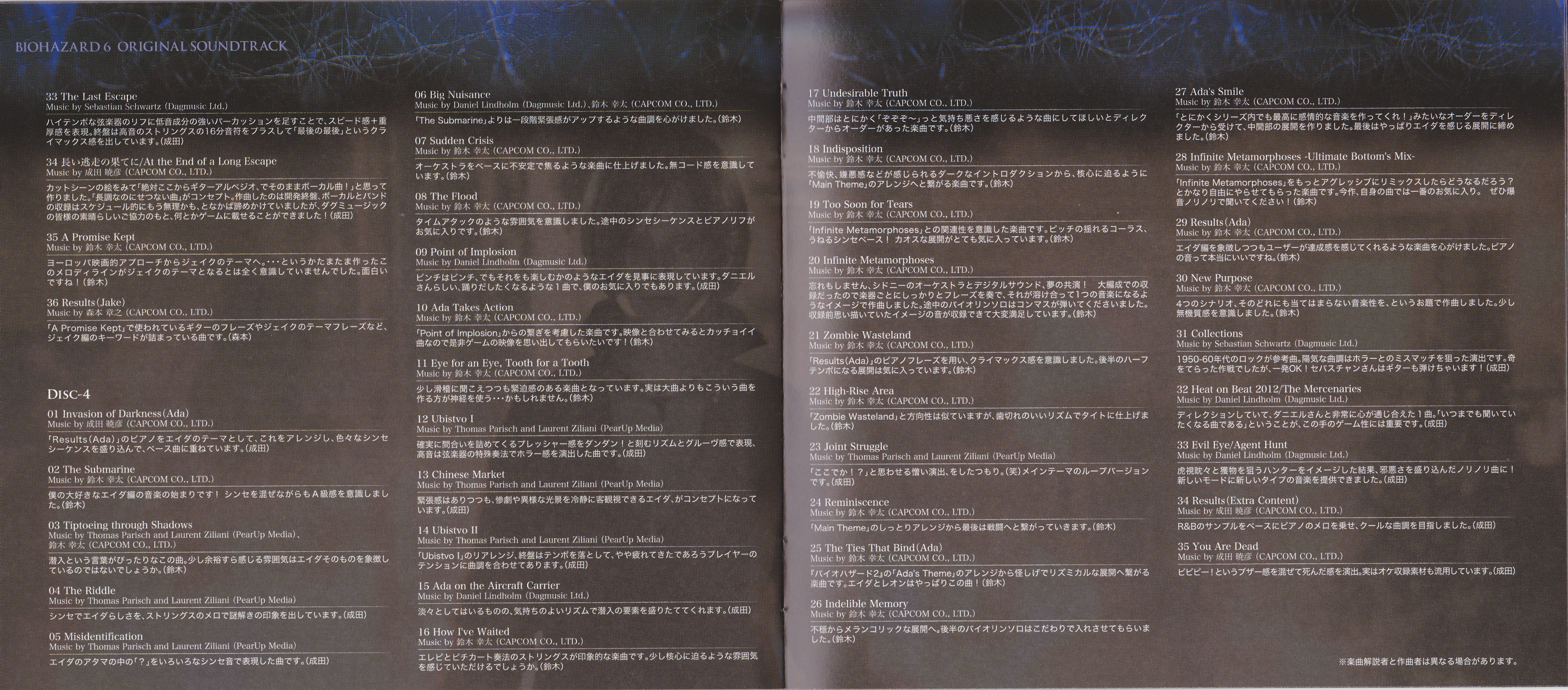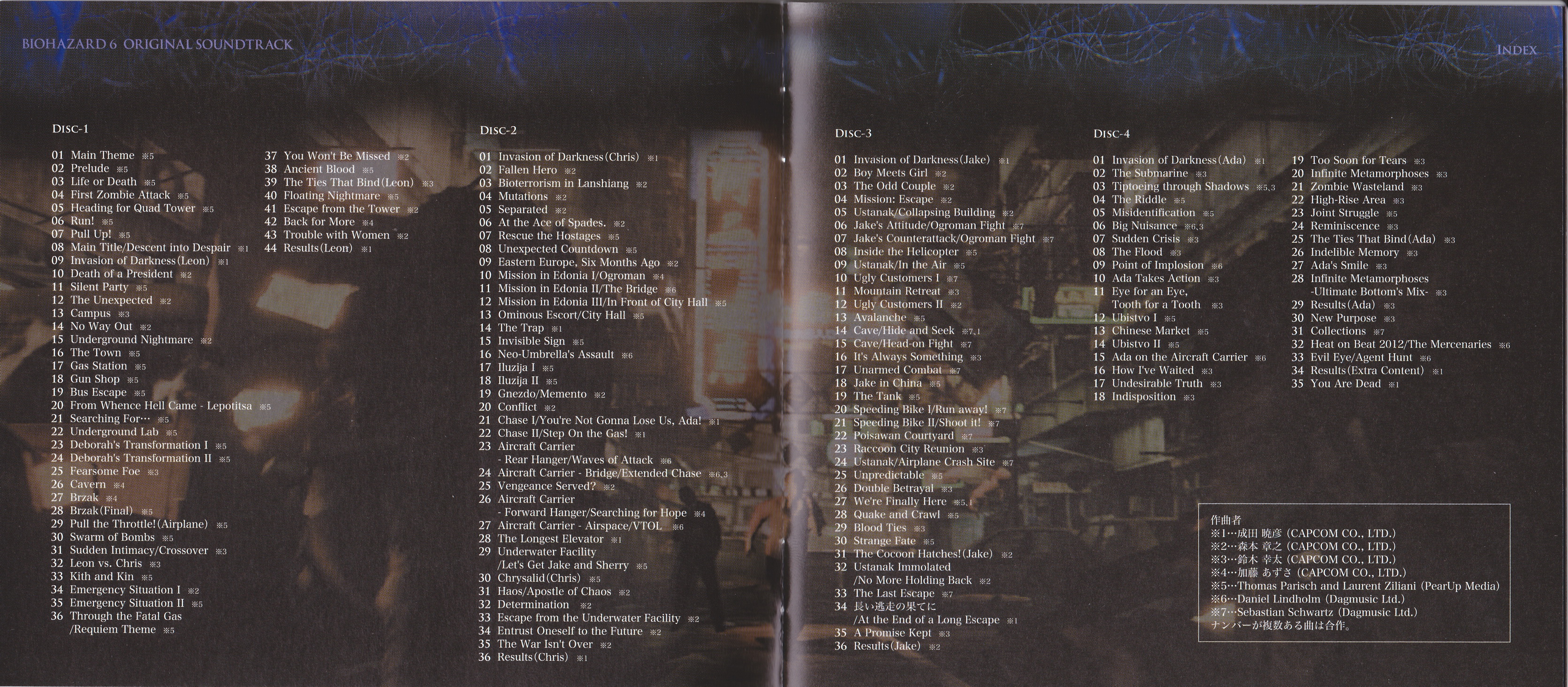 На каждый из четырех дисков саундтрека приходится по одному сценарию игры. Biohazard 6 Original Soundtrack это работа по большей части оркестрового толка, с несколькими электронными и фолк-рок композициями. В лучших традициях серии вялотекущие треки соседствуют с нагнетающими атмосферу тревожными. Сеттинг игры весьма разнообразен: это и современный мегаполис, и заснеженные горы с глубокими пещерами, и древние провинциальные городки в Восточной Европе… Для каждой локации композиторам удалось создать свое, отличительное настроение посредством музыки.