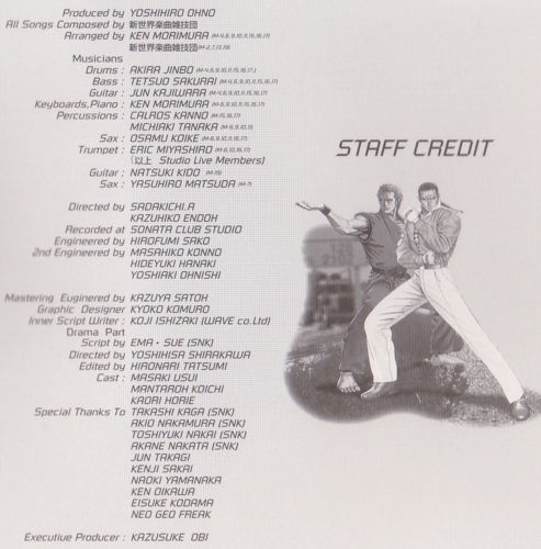 Special Thanks To Takashi Kaga (SNK), Akio Nakamura (SNK), Toshiyuki Nakai (SNK), Jun Takagi, Kenji Sakai, Naoki Yamanaka, Ken Oikawa, Eisuke Kodama, Neo Geo Freak