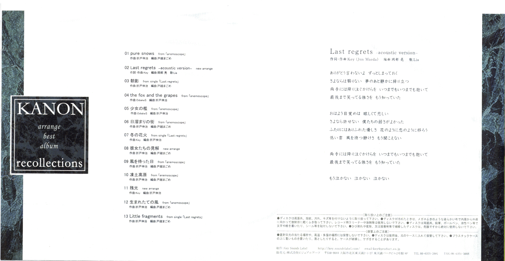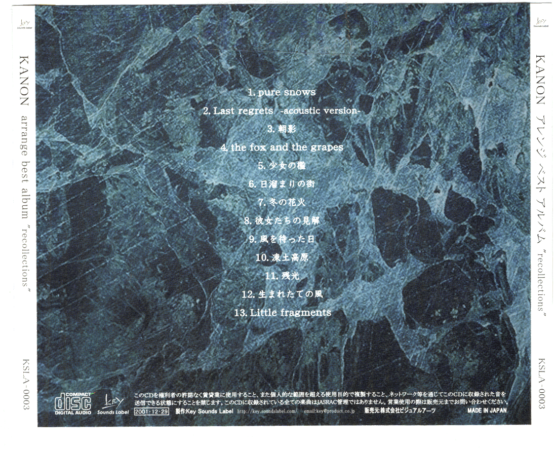 A selection of arrangements of music from Key's PC visual novel. Tracks 1, 4, 5, 6, 9, 10, and 12 are from the album Anemoscope included with the game's first printing; tracks 3, 7, and 13 are from the Last Regrets single; and tracks 2, 8, and 11 are new arrangements.