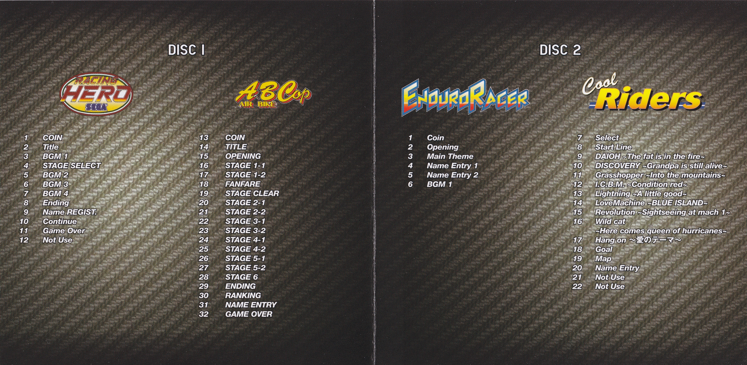 Composers : Hikoshi Hashimoto (Racing Hero, A.B. Cop), Hiroshi Miyauchi (Enduro Racer, Cool Riders)