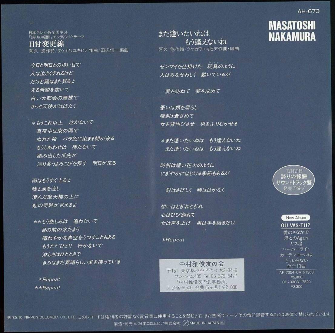 Hizuke Henkousen/Mata Aitai ne wa Mou Aenai ne / MASATOSHI NAKAMURA