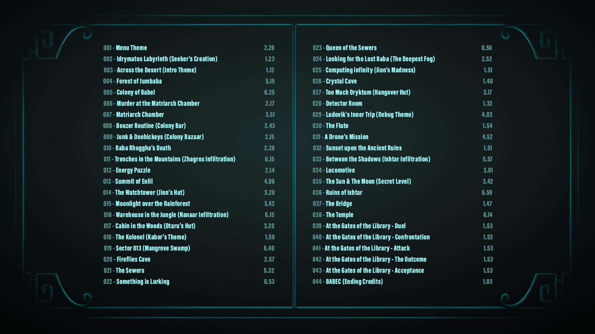 The Library of Babel Sountrack is a 44 track original soundtrack composed and performed by Tanuki Game Studio. The music captures the ambience of a strange future that is at once futuristic and developed while also being closely connected to humid jungles around it.