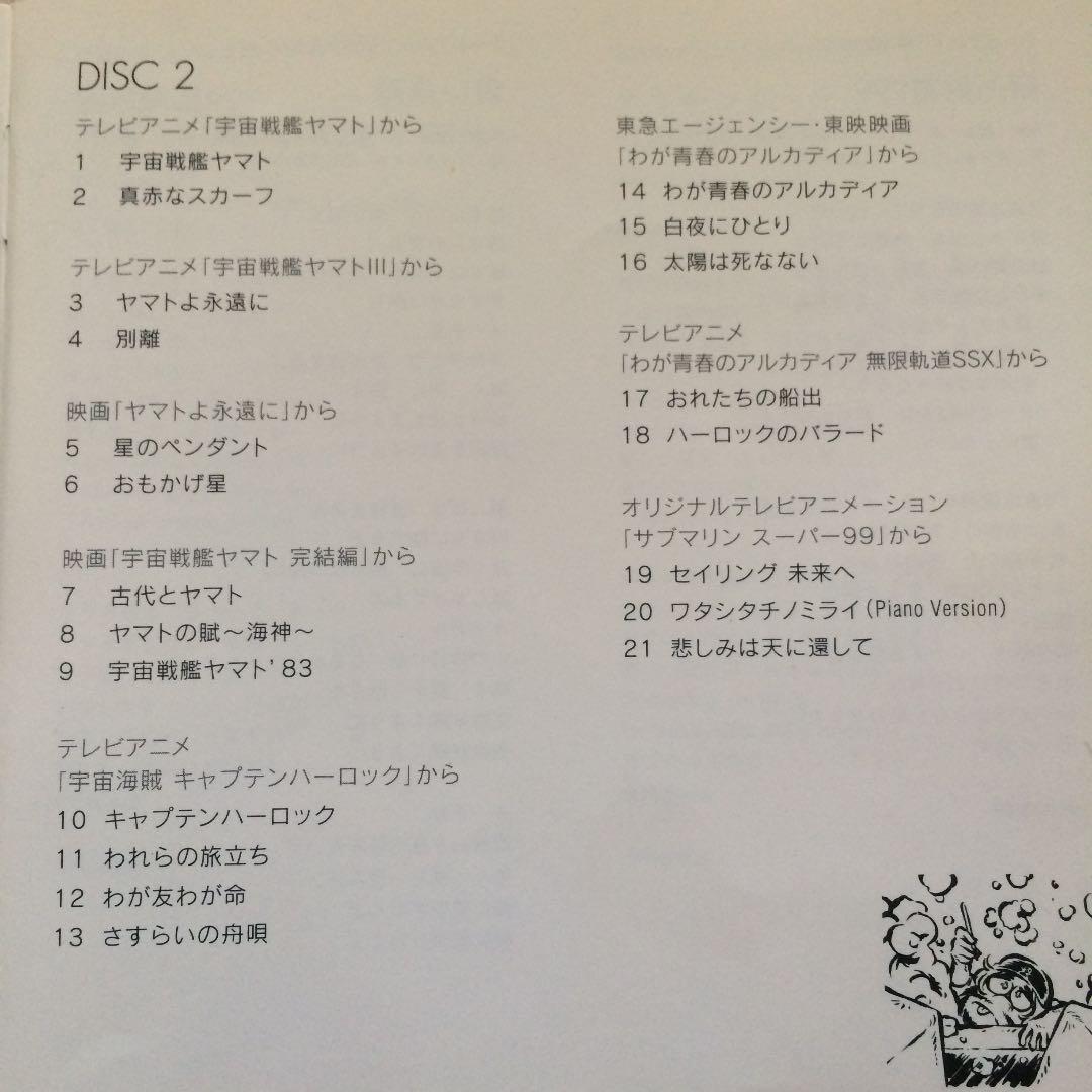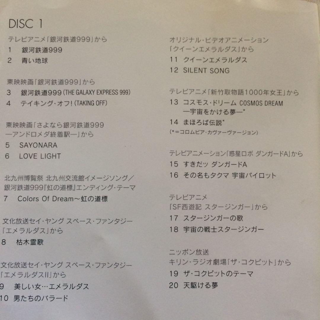 It includes a lot of songs from the album "Matsumoto Leiji no Sekai" (CC-4341~2) but in a different order, adding songs from new released anime like "Queen Emeraldas" and "Submarine Super 99".