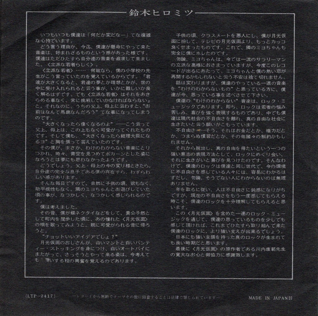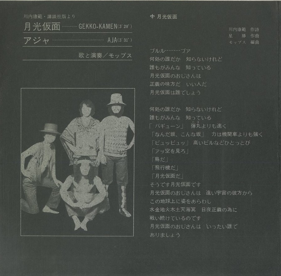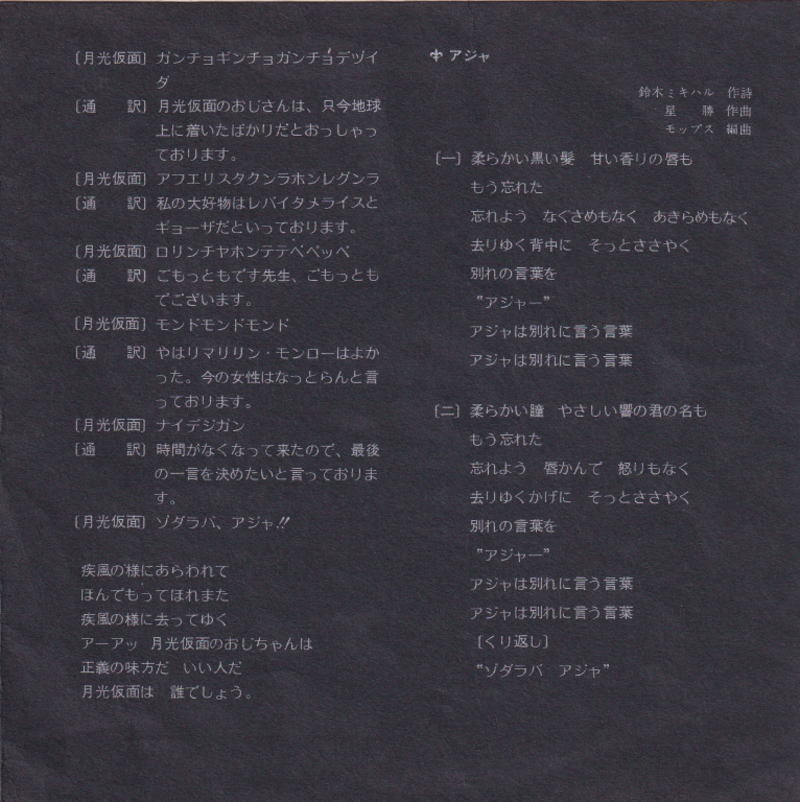 *The lyrics are a parody song with original theme song changed to a heavy blues rock. In the middle of the song, there is an interview with Gekkou Kamen himself, who spouts gibberish words and narrations that play with the narration of "Superman"
