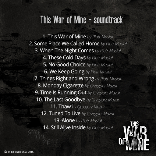Музыка играет важную роль в мрачном настрое This War of Mine. Созданная великолепным Piotr Musiał, она запечатлит в памяти лучшией моменты этой замечательной игры.