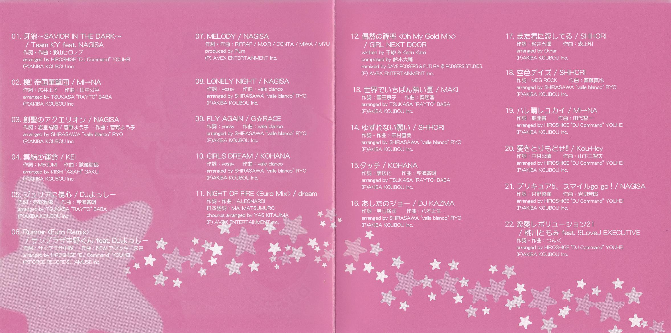 | Композиторы | A.LEONARDI / CONTA / Daisuke Suzuki / Hiroaki Serizawa / Хиронобоу Кагеяма / Kaori Okui / Кохэй Танака / M.O.R / Masaaki Mori / Masao Yagi / Michio Yamashita / Miwa / myu / Naomi Tamura / New Funky Sueyoshi / RIPRAP / Синя Сайто / Сиро Сагису / Tomokazu Tashiro / Tsunku / Valle Blanco / Ёко Канно / Yoshiro Iwakiri |