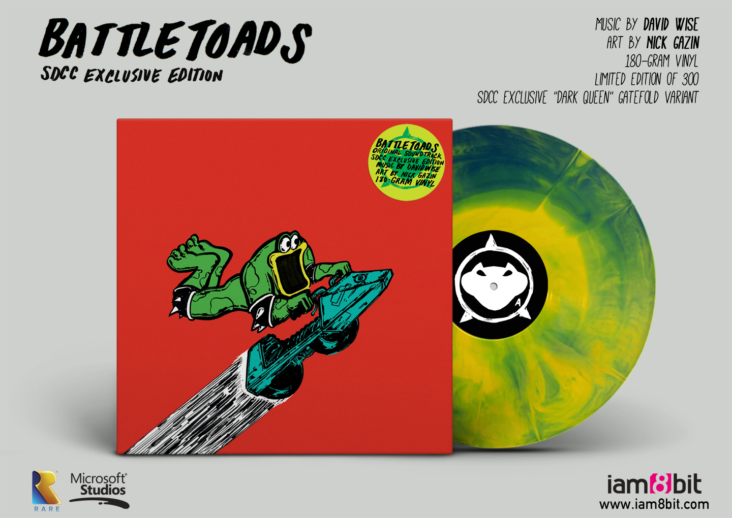Винил Battletoads, который будет доступен с изображением разных артов от Ника Газина, включает саундтрек Дэвида Уайза. Пластинка весом 180 грамм идет в наборе с эксклюзивным вкладышем и обложкой. 300 пластинок будут доступны на выставке Comic-Con по $25 каждая.