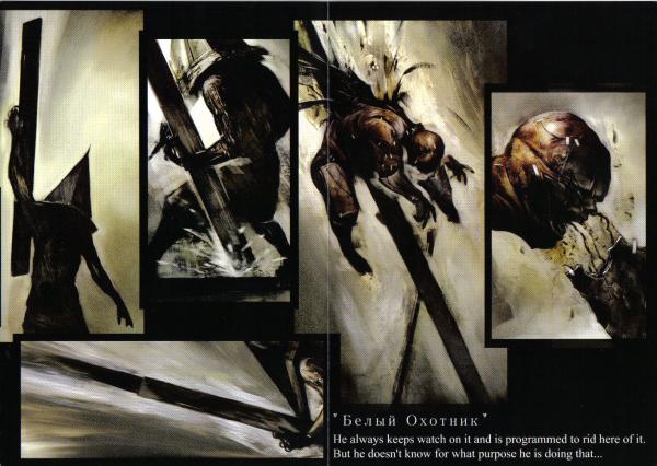 Отдельное слово необходимо замолвить о буклете альбома. Музыкальный диск вложен в DVD бокс не спроста. Внутри буклета нет традиционных текстов песен, зато есть маленький комикс от известного японского художника Масахиро Ито, нарисовавшего монстров для серии SH. Комикс называется “Белый охотник”, причём вот прямо так, на русском языке, и посвящён главному объекту устрашения – Пирамидаголовому, изображённому также на обложке. Сам комикс уходит на второй план, и голову начинают посещать догадки относительно русских буковок. В этой запутанной ситуации русскому человеку без бутылки, по всей видимости, никак не разобраться. О реакции японцев и всего остального мира даже думать страшно. Амэн!