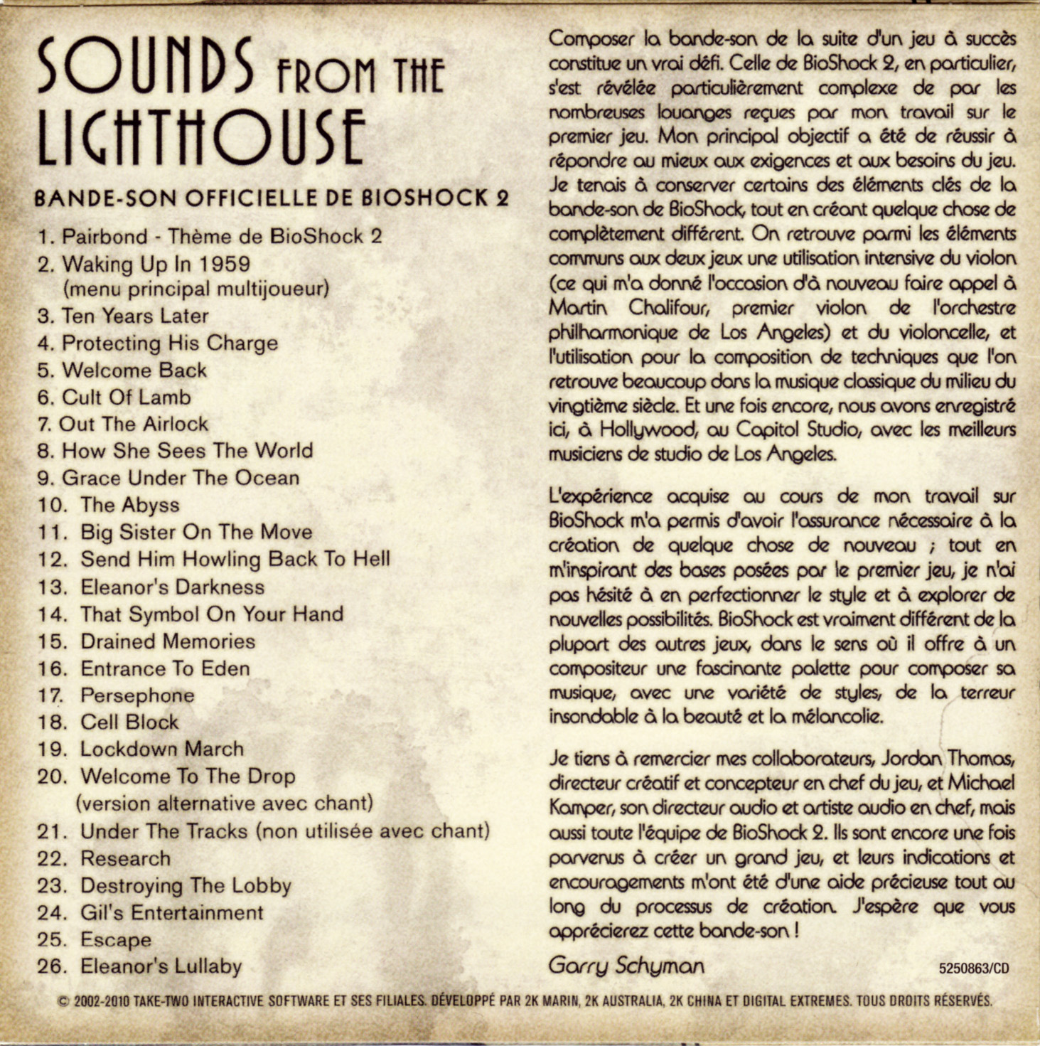 Над альбомом работал американский композитор Гарри Шиман (BioShock 2 Special Edition Soundtrack, Bioshock 2, Greatest Video Game Music, The), а его релиз состоялся 9 февраля 2010 года. На саундтрек попало 26 композиций общей длительностью около 50 минут. Подборка является компиляцией оригинальной музыки. Выпуском пластинки занимался лейбл 2K Games.